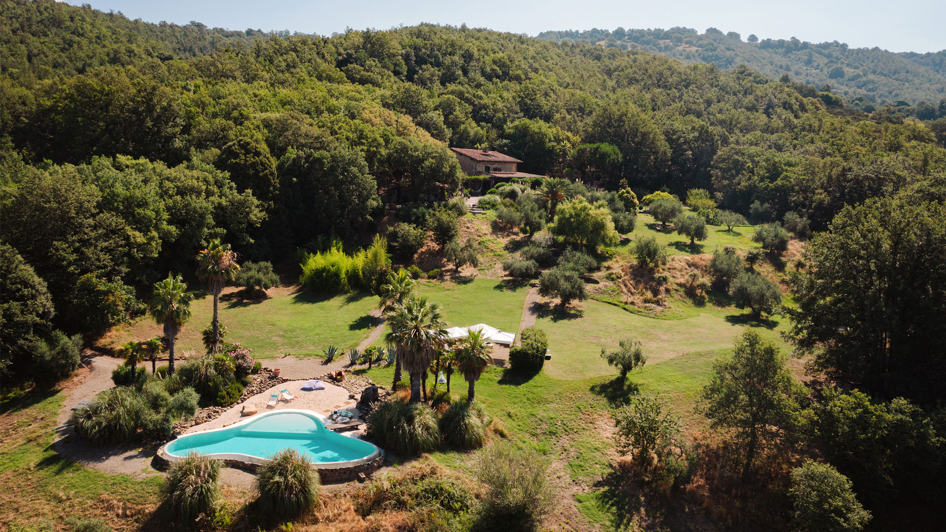 At its heart is Villa Sunoom – The Stone House, a restored Tuscan villa with five suites and a penthouse, surrounded by terraced gardens, a spring-fed pool, and views across the Albegna Valley.
